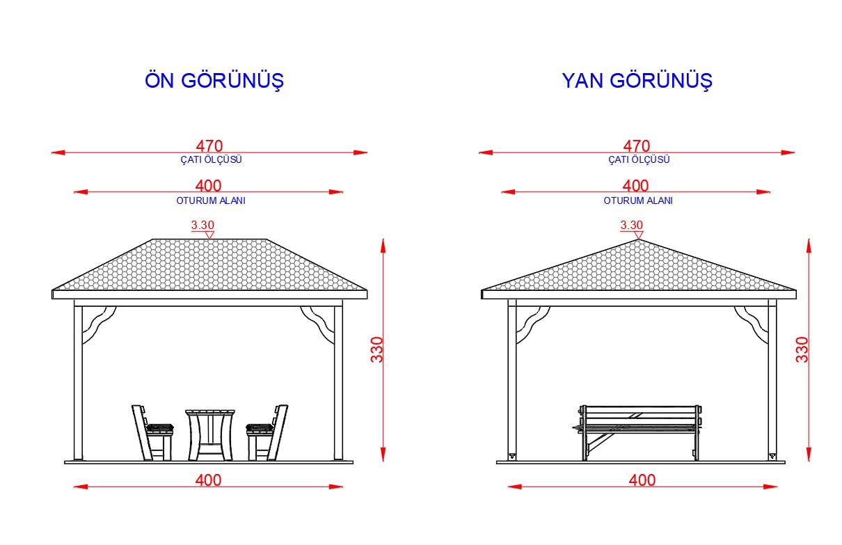 Taşıyıcı ayakların altına 18x13x3 mm flanş üzeri 15x8x2 mm silme kaynatılacak, 13x8x3 mm plakaya iki adet dübel veya ankraj deliği delinecek, 15x8x2 mm her bir plakaya 3’er adet 6 mm vida deliği delinecektir. Ankrajlar taşıyıcıların altına vida ile monte edilecektir. Zemine de çelik dübeller vasıtasıyla bağlanacaktır. Böylece hem ahşapların suyla teması önlenecek hem de taşıyıcı ayakların yere montesini sağlayacaktır. Kamelya ankrajları minimum 2,5 mm sactan mamül flanşlar dikmenin minimum iki tarafını saracak şekilde kaynaklama yöntemi ile birleştirilerek imal edilecektir. Ankrajların dikmelerin ayaklarına bağlantısı için her ayağa 6 adet gelecek şekilde özel vidalar atılır. Ankrajların yere bağlantısı için her ayağa 2 adet olacak şekilde dübelli vidalar atılacaktır. Tüm metal aksam polyester esaslı toz boya ile fırınlanmak suretiyle boyanacaktır.