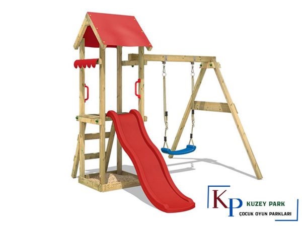 15-30620 Ahşap Çatılı Kaydıraklı Salıncaklı Set