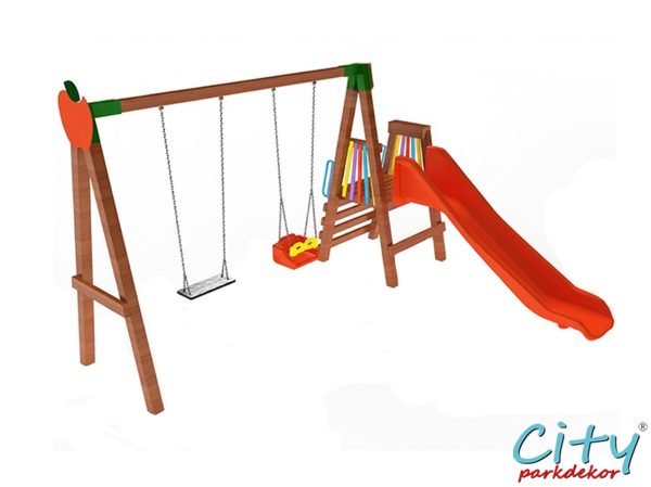 08 – 30650 – Ahşap Çift Kaydıraklı Tırmanmalı Salıncaklı Set