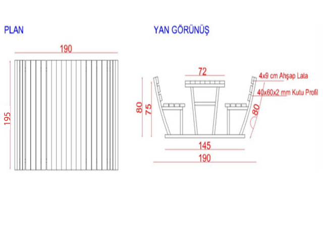 Piknik Masası (Metal Ayaklı) 195(L)x190(W)x80(H)