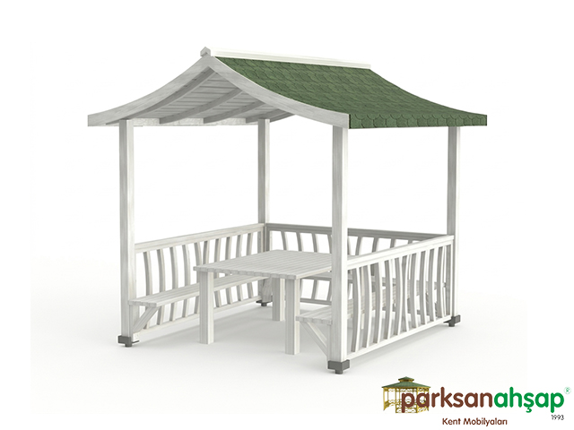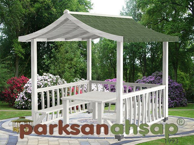 Beyaz Ahşap Çardak; hem şık tasarımı ile bulunduğu ortamın dekorasyonunu tamamlar hem de içerisinde bulunan oturma birimi ve ahşap masa ile oldukça kullanışlı ve basit bir yapı oluşturur.