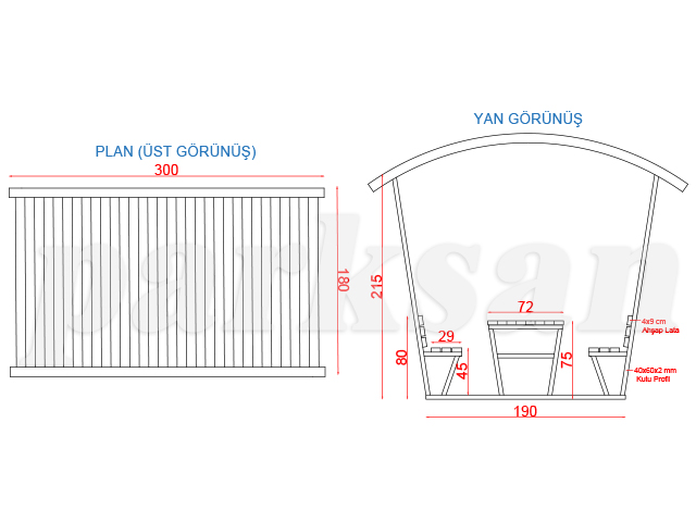 Oturma birimleri iki adet karşılıklı olup; oturma genişliği 40 cm, uzunluk 180 cm, oturma yüksekliği 45 cm’dir. Oturma birimi taşıyıcı kısımları 40 x 60 mm elektrostatik toz fırın boyalı metal profilden imal edilecektir. Oturma birimi için 6 adet min. 40 x 90 mm ahşap lata, sırt kısmı için 6 adet min. 40 x 90 cm ahşap lata, taşıyıcı metal profillere özel galvanizli vidalarla montelenecektir.