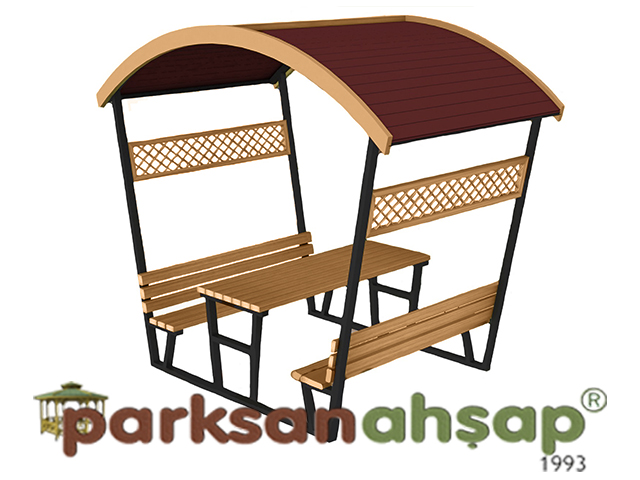 Çatılı piknik masası alt taşıyıcı; 40 x 80 mm elektrostatik toz fırın boyalı metal profilden imal edilecektir. Alt taşıyıcı profile masa profilleri ve oturma bankı profilleri özel galvanizli vidalarla montelenecektir.