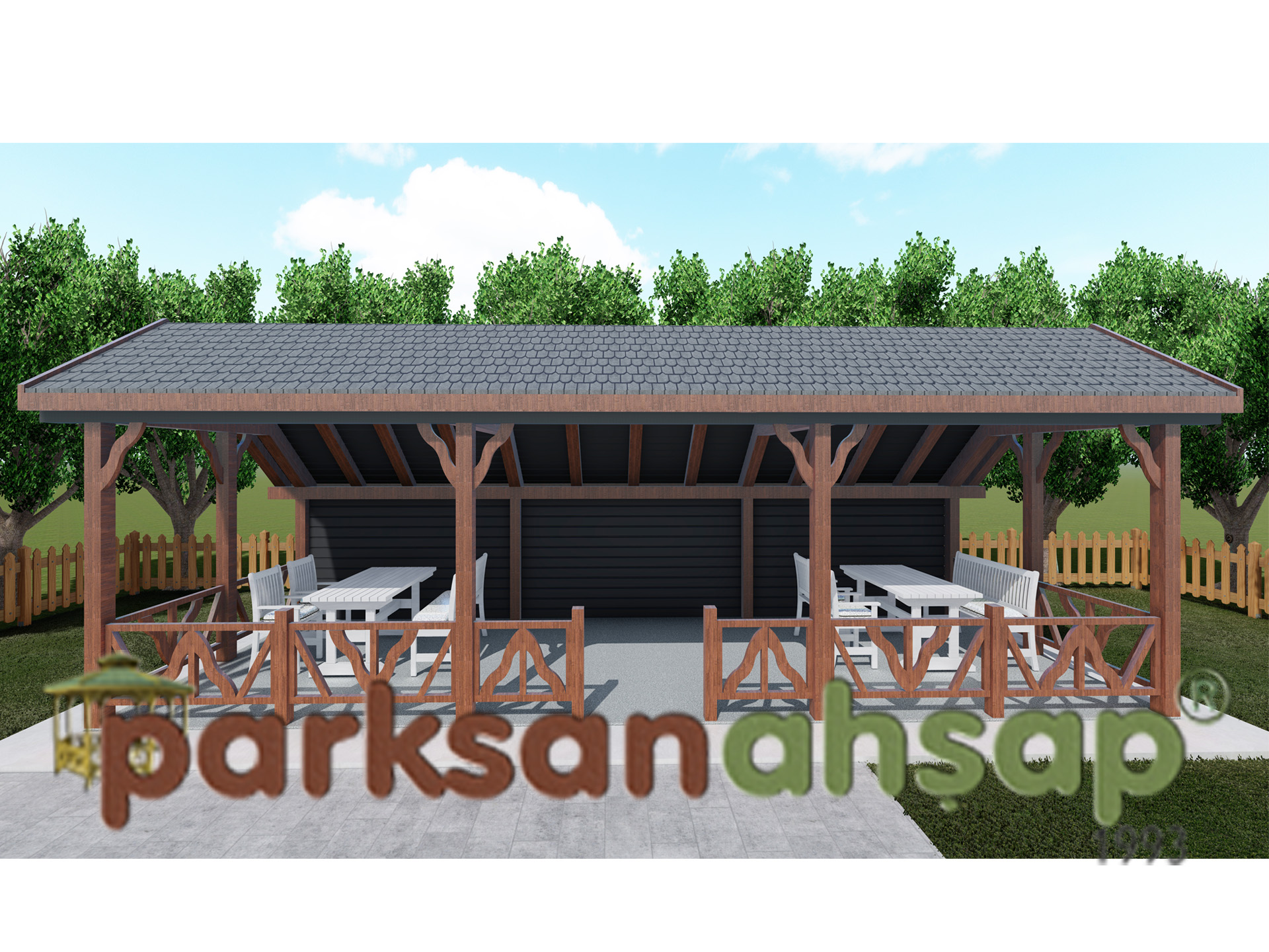 Kamelyanın çatı kısmının taşıyıcı lataları 50 x 100 mm ahşaptan imal edilecektir. Lataların iki köşesi frezeden geçirilerek şekil verilecektir. Lataların üzeri ahşap yalı baskı lambri ya da fiber malzeme ile vidalanacaktır. . Lambri üzerine ziftli membranlar geniş başlı özel çivilerle monte edilecektir. Yine geniş başlı özel çivilerle Amerikan kiremidi adı verilen shingle denen çatı kaplama malzemesi ile kaplanacaktır. Alın tahtası kısmın Alın tahtası kısmında; min 30 x 130 mm ebatlarında elmas uçlu özel bıçaklarla motif verilmiş ahşap latalar çatı latalarına özel galvanizli vidalarla monte edilecektir. Çatı bağlantısı için her iki ucu belirli açılarla kesilmiş iki köşesi elmas uçlu özel bıçaklarla şekillendirilmiş 8 adet min. 50 x 50 mm latalarla çatı bağlantı karkası bir ucu taşıyıcı kısma bir ucu alın tahtasına monte edilecektir.