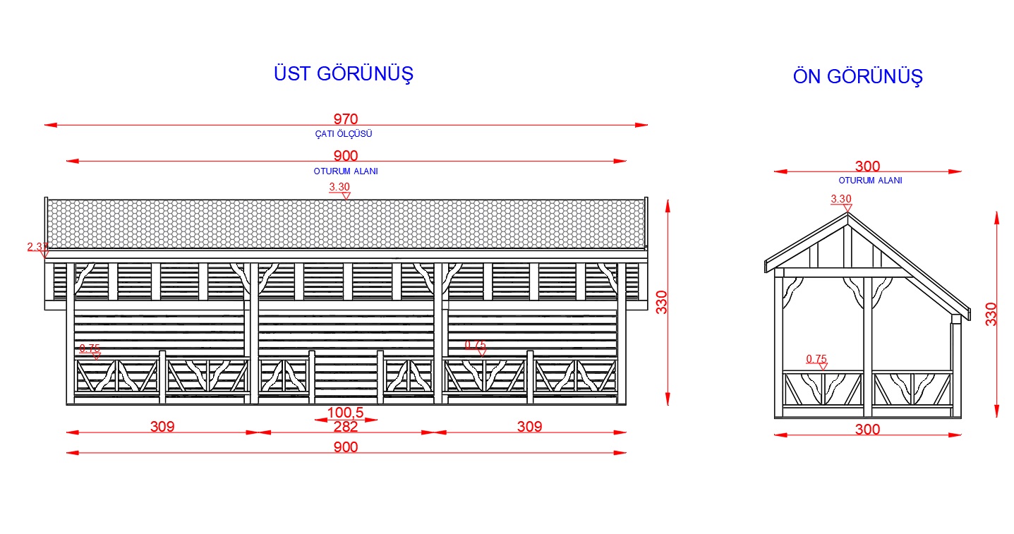 Üst korkulukların genişliği 35 cm’dir. Korkuluk çerçeveleri 50 x 50 mm ebatlarında her yönü zımparalanmış özel elmas uçlu bıçaklarla kenarları pahlandırılmış ahşaptan imal edilmiştir. Korkuluk çerçeveleri ana taşıyıcıya özel galvanizli ağaç vidalarıyla montelenecektir. Ara motifler de 40 x 50 mm ölçülerindeki ahşaptan imal edilmiştir. Bu ahşaplar alt ve üst korkuluk çervevesine özel galvanizli vidalarla monte edilecektir.
