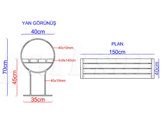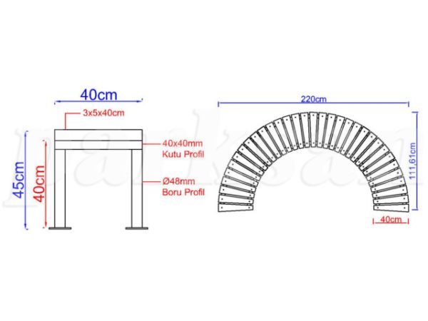 Taşıyıcı Ayaklar: 40 cm genişliğinde, 1 cm et kalınlığında çember şeklinde metal profilin aynı ölçülerde 2 adet metal profille ve zemin bağlantısı için 40×5 cm ölçülerinde, 1 cm et kalınlığında metal profille kaynatılması ile oluşturulan metal ayak