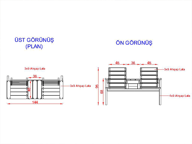 Oturma birimlerinin oturma genişliği 30 cm, uzunluk 140 cm, oturma yüksekliği 45 cm’dir. Oturma birimi taşıyıcı kısımları elmas uçlu özel bıçaklarla motif verilmiş min. 40 x 90 mm ebadında çam keresteden imal edilecektir. Oturma birimi için 6 adet min. 40 x 90 mm ahşap lata , sırtlık için 4 adet min. 40 x 90 mm ahşap lata taşıyıcı ahşap kısımlara özel galvanizli vidalarla montelenecektir.