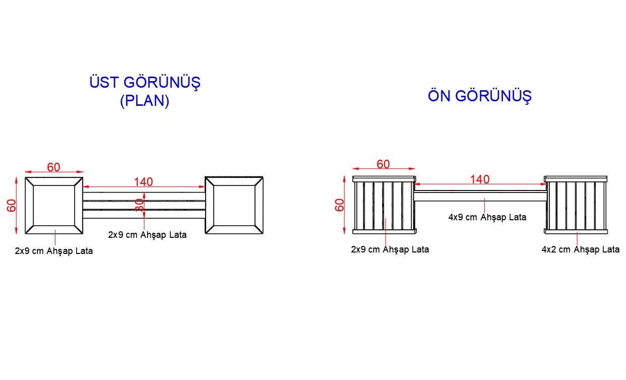 - Her iki saksıyı birleştiren 4x9x140 cm ölçülerinde 3 adet ahşap bank kullanılacaktır.