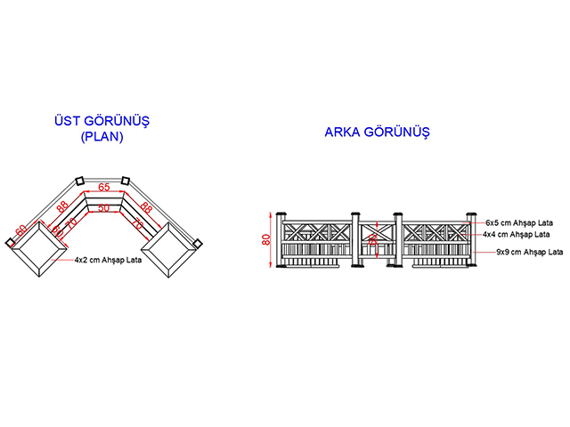 8. Ahşap bank ve saksıların hemen arka kısmında 9x9x80 cm yüksekliğinde 4 adet baba kullanılacaktır. 9×9 cm lik babalara bağlı olacak şekilde 6×5 cm ölçülerinde korkuluk çerçevesi ve 4×4 cm ölçülerinde korkuluk içi latalar kullanılacaktır.